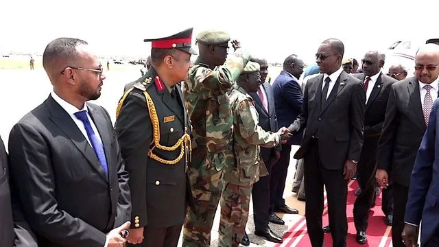 وكان في استقباله لدى وصوله مطار جوبا السيد ضيو مطوك وزير الاستثمار بدولة جنوب السودان، وطاقم السفارة السودانية بجوبا.