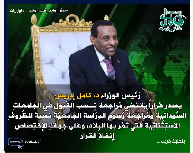 أصدَر رَئيس الوزراء د. كامل إدريس، قراراً يَقتضِي مُراجعة نِـسب القَبول في الجَامعاتِ السُّودَانِية ومُراجَعة رُسوم الدِرَاسة الجَامِعِيّة نسبة للظُروفِ الاستِثنَائِية التي تَمُر بها البِلاد، وعَلى جِهاتِ الإختِصَاص إنفاذِ القرار.