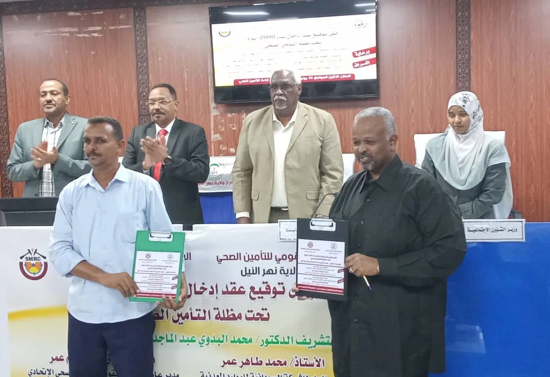 شهد والي نهر النيل الدكتور محمد البدوي عبد الماجد بقاعة التأمين الصحي بعطبرة الاثنين التوقيع على عقد بين شركة الموارد المعدنية والتأمين الصحي بولاية نهر النيل بحضور عام المدير العام لشركة الموارد المعدنية محمد طاهر عمر والمدير العام لصندوق القومي للتأمين الصحي الاتحادي دكتور فاروق نور الدائم عمر لتغطية(2) الف اسرة بخدمات التأمين الصحي في محليات الولاية.