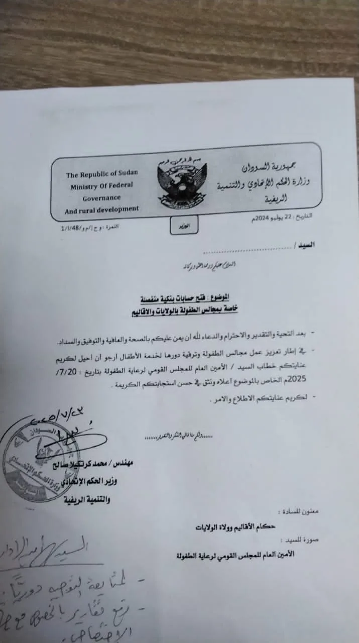 في إطار تعزيز عمل مجالس الطفولة وتطوير دورها في خدمة الأطفال، أصدر المهندس محمد كرتكيلا صالح، وزير الحكم الاتحادي والتنمية الريفية، توجيهاً للجهات المختصة في الولايات والأقاليم بفتح حسابات بنكية منفصلة لكل مجلس طفولة، وذلك تسهيلاً للعمل.