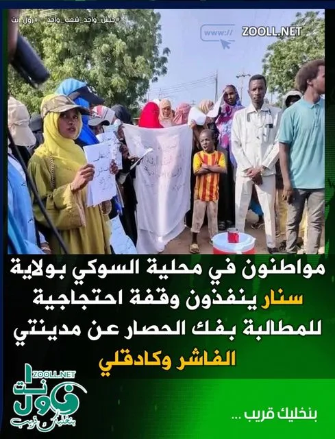 مواطنون في محلية السوكي بولاية سنار ينفذون وقفة احتجاجية للمطالبة بفك الحصار عن مدينتي الفاشر وكادقلي