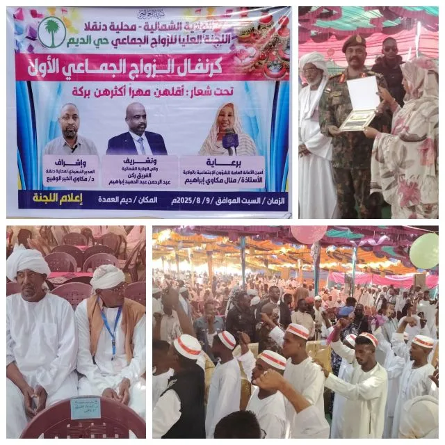 تزين وتجمل وازدانه جمالا و نورا حي الديم التابع لمحلية دنقلا وبميدانة الكبير الذي امتلئ علي جنباته من الضيوف وأهله وليشهدوا عقد زاوج جماعي لعدد 50 زيجة تحت شعار (أقلهن مهرا اكثرهن بركة) برعاية سعادة الفريق ركن عبد الرحمن عبد الحميد ابراهيم والي الولاية الشمالية ورعاية الاستاذة منال مكاوي ابراهيم الامين العام للشؤون الاجتماعية بالولاية واشراف الدكتور مكاوي الخير الوقيع المدير التنفيذي لمحلية دنقلا