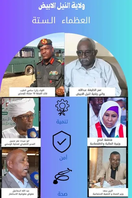 يتقدمهم المجاهد عمر الخليفة عبد الله والي ولاية النيل الأبيض الذي جعل اهل الولاية كلهم جيش الا من في نفسه مرض يري غير ذلك وفي مجال الخدمات رغم ظروف الحرب الخليفة نجح في هذا الملف نجاح قد يراه كثيرين ويغيب عن اخرين والشواهد كثيرة الخليفة طاف كل محليات الولاية وأعلنت دعمها للجيش رجل لا يعرف طريق القبلية والمناطقية شخصية عامة يمتاز بالقوة والحسم