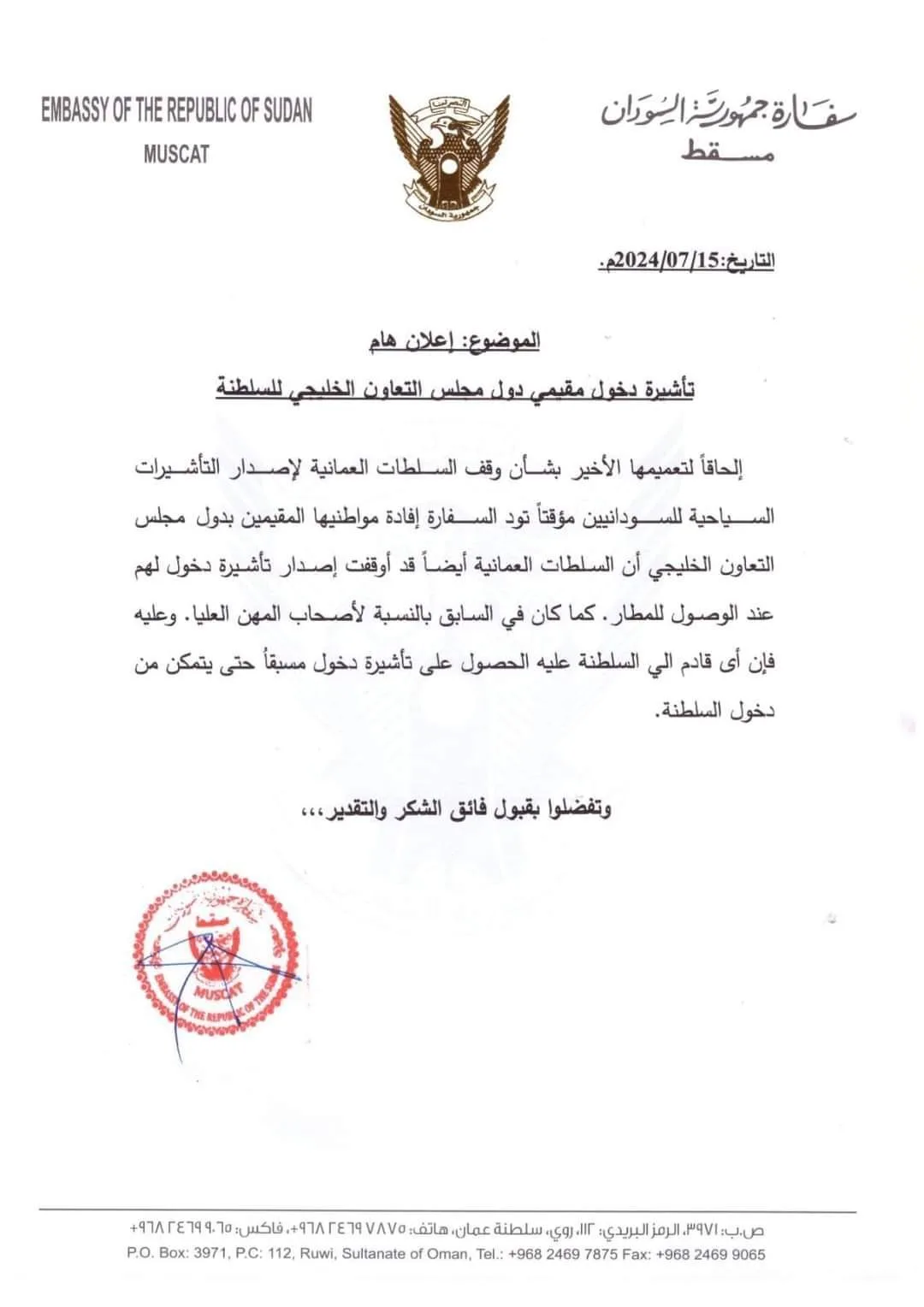 اعلان مهم من السفارة السودانية بمسقط حول قرار سلطنة عمان بإيقاف تأشيرات السودانيين المقيمين بدول الخليج