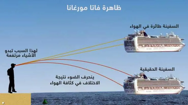 * السفن الطائرة: قد يبدو أن سفينة تبحر في الأفق تطفو في الهواء.