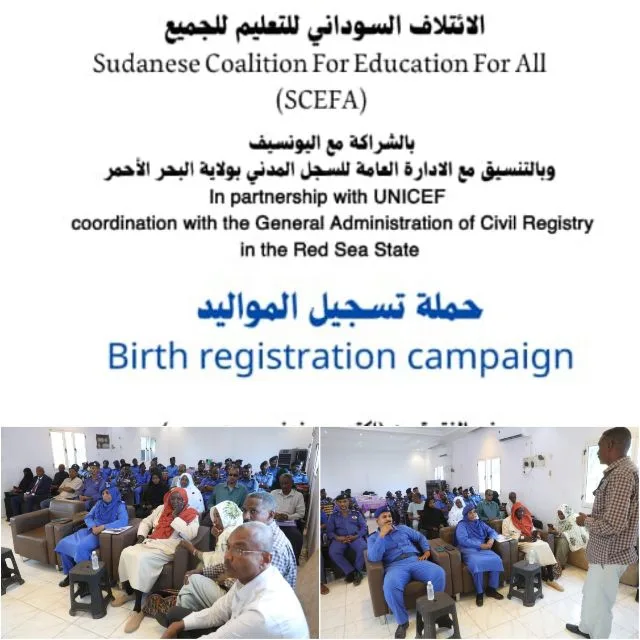 نظم الائتلاف السوداني للتعليم للجميع بالشراكة مع منظمة اليونسيف و الإدارة العامة للسجل المدني بولاية البحر الأحمر ورشة تدريبية لتسجيل المواليد خلال شهر أكتوبر وحتي ديسمبر لمنسوبي السجل المدني بالولاية.