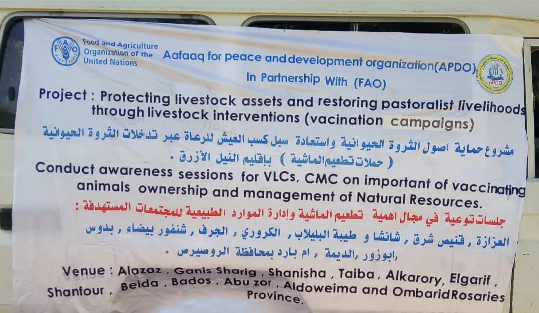 من جانبه ابان الاستاذ يونس محمد علي مدير البرنامج بمنظمة افاق للسلام والتنمية منظمة وطنية تاسست في العام 2021 وتعمل بعدة قطاعات ( الامن الغذائي وسبل كسب العيش – الصحة والتغذية – الحماية – السلام) واضاف يونس ام ان مشروع حماية اصول الثروة الحيوانية عبر تدخلات الثروة الحيوانية ضمن مشروع الامن الغذائي وسبل كسب العيش بتمويل من منظمة الاغذية والزراعة ( الفاو) و يتضمن مكون التوعية باهمية تطعيم الماشية وادارة الموارد الطبيعية ومكون تطعيم الماشية والمستهدف 355 الف جرعة والاولوية لصغار مربي الماشية ويهدف بشكل اساسي لاعادة سبل كسب العيش لصغار مربي الماشية والاستقرار والتنمية والسلام المستدام.