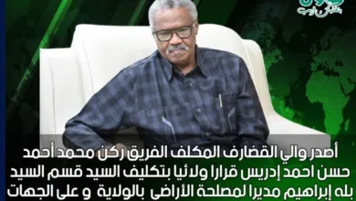 أصدر والي القضارف المكلف الفريق ركن محمد أحمد حسن احمد إدريس قرارا ولائيا بتكليف السيد قسم السيد بله إبراهيم مديرا…