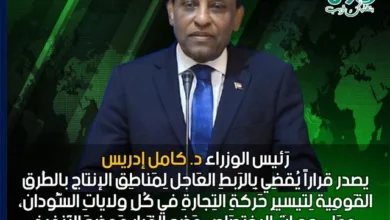 أصدَر رَئيس الوزراء د. كامل إدريس، قراراً يُقضِي بِالرَبطِ العَاجل لِمَناطِق الإنتاج بالطُرق القَومِية لِتيسِيرِ حَركةِ التِجارةِ في كُلِ وِلاياتِ…