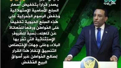 أصدَر رَئيس الوزراء د. كامل إدريس، قراراً بِتَخفيض أسعار السِلع الأساسية الإستهلاكية وخفض الرسوم الجُمرِكِية عَلى هَذِه السِلع الحَيَوية تَخفِيفاً…